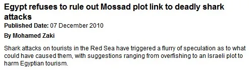 In December 2010, The Scotsman blamed the Mossad for shark attacks in the Egyptian resort of Sharm-el-Sheikh. In August 2015, Hamas claimed to have captured a dolphin equipped with spying devices off the shore of the Gaza Strip.