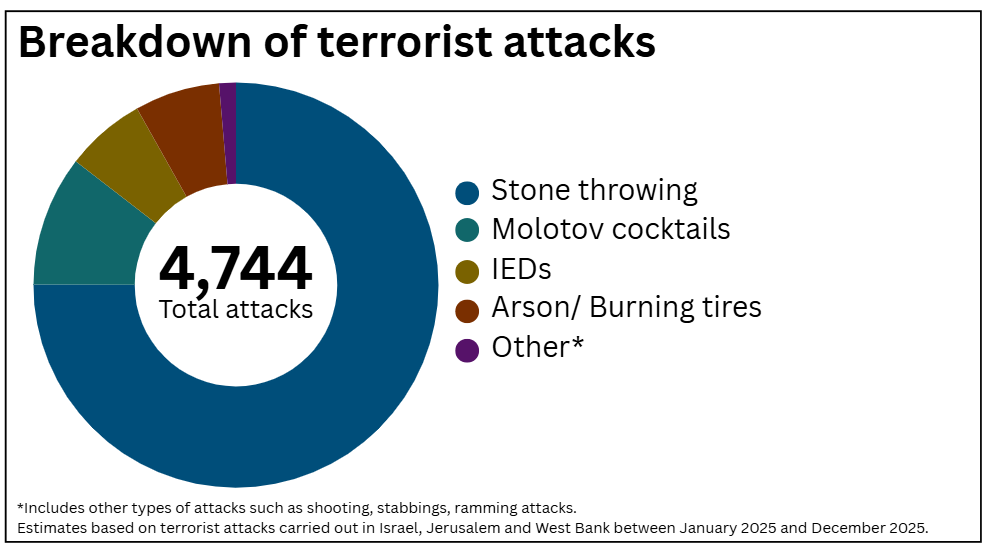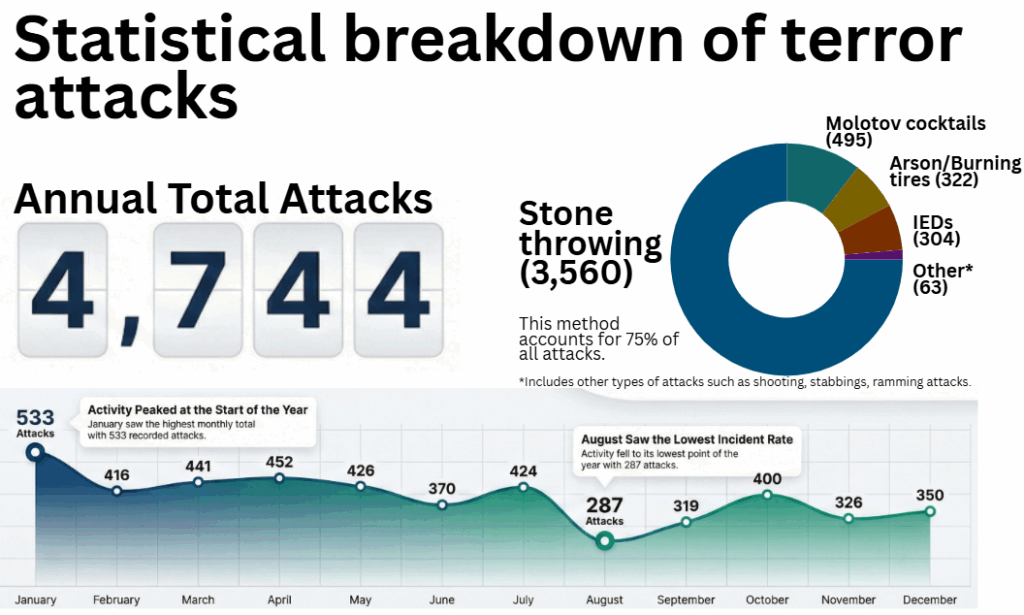 - Despite a reported decline in West Bank attacks, the Shin Bet recorded 4,744 terror-related incidents in Israel in 2025, targeting civilians and security forces across the country.