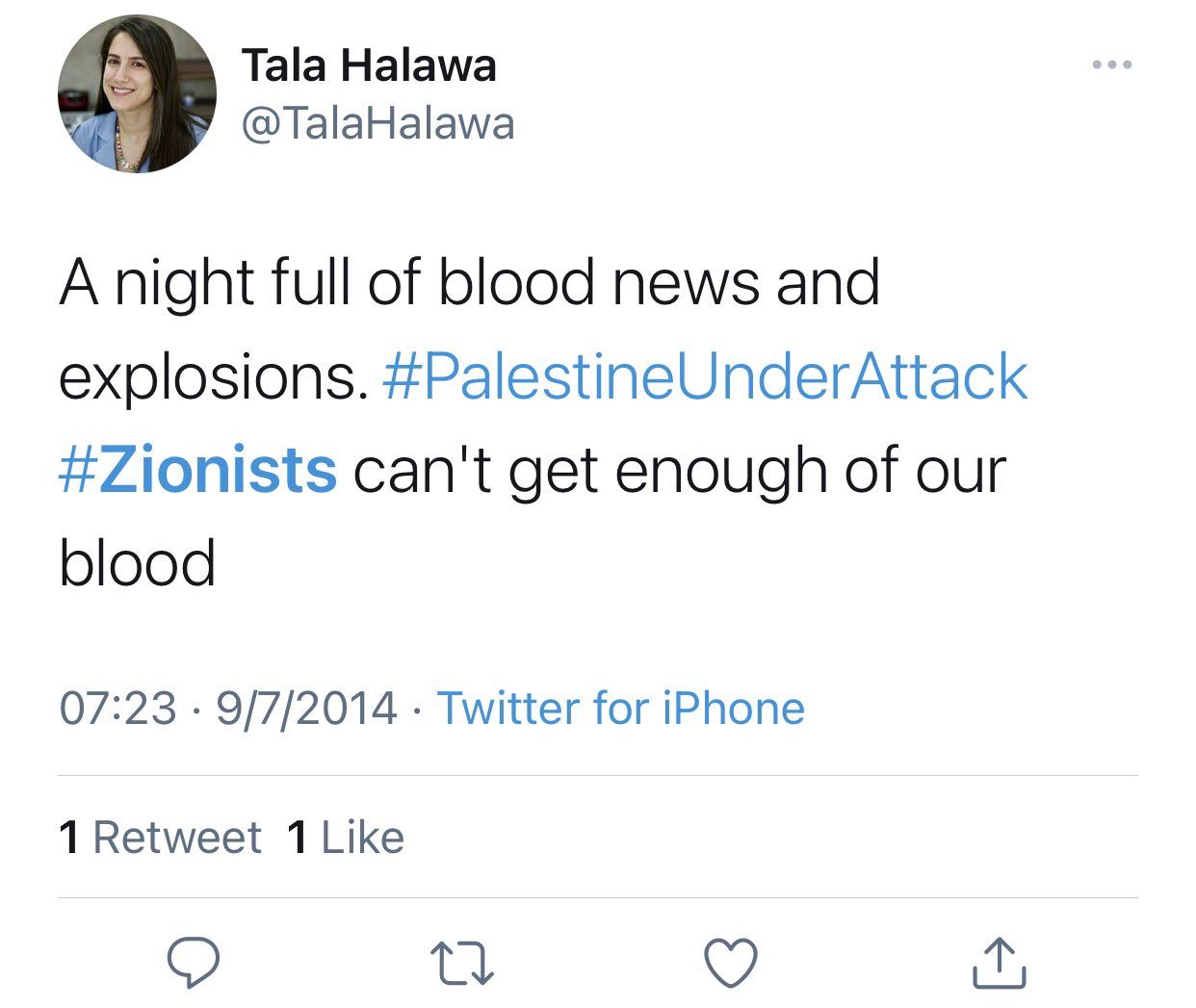 Alerted by HonestReporting’s tweet about Halawa’s odious comments about Israel and the Nazis, other social media users managed to document more hate-filled posts before Halawa locked down her Twitter profile so only followers could view her tweets. Among them were modern variations of the classic blood-libel, such as this tweet, claiming, “Zionists can’t get enough of our blood.”