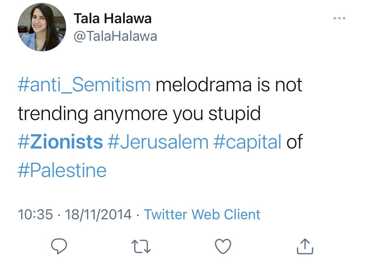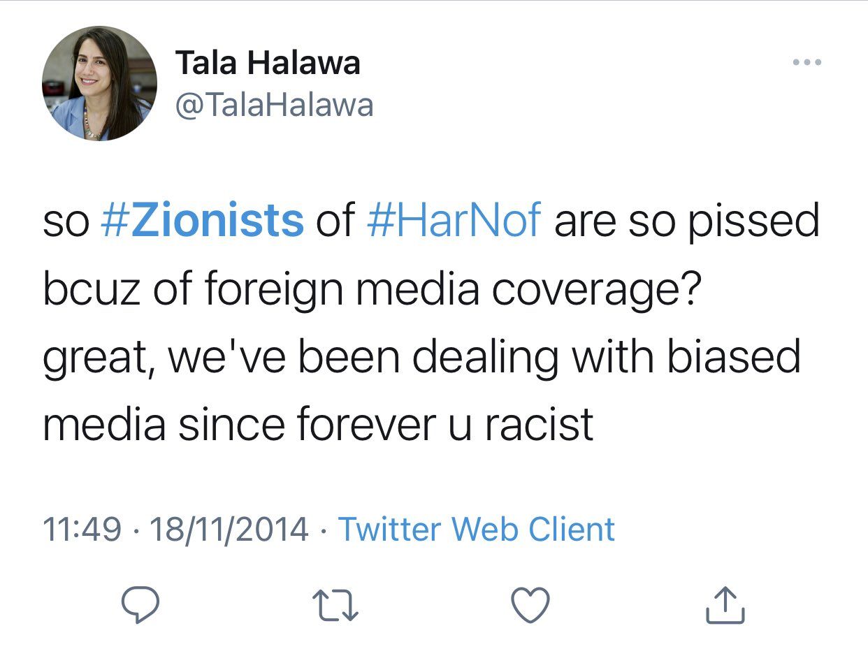 And in one particularly vile tweet she mocks the massacre of religious orthodox Jews attending prayers at a synagogue in the Jerusalem neighborhood of Har Nof: