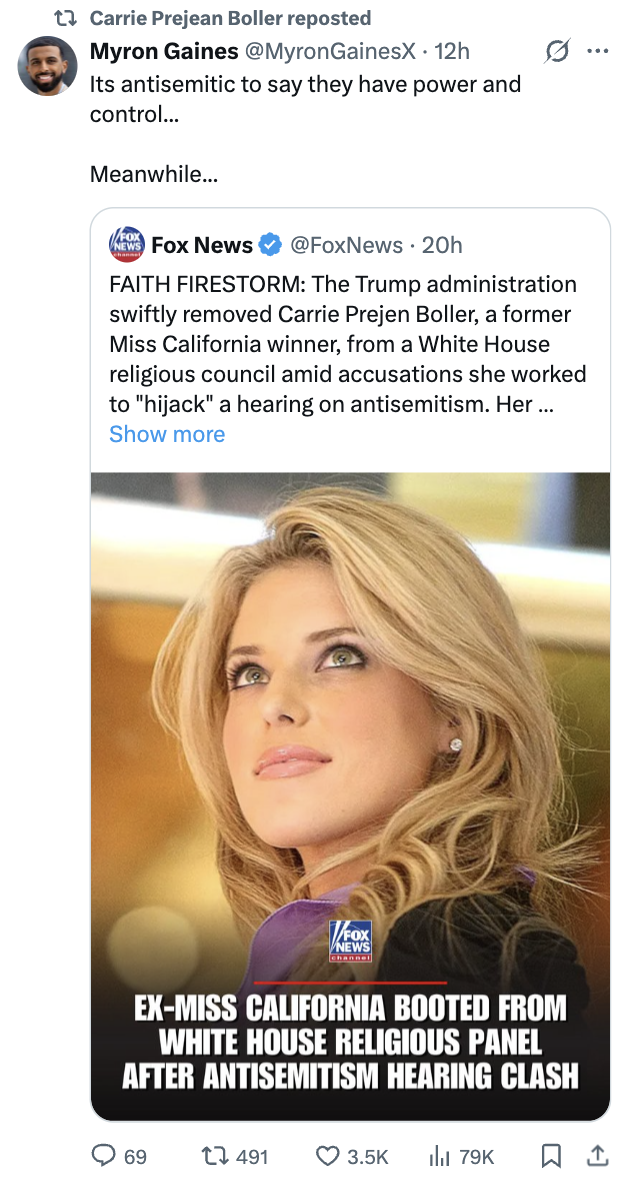 Myron Gaines inevitably joined the crowd on X to suggest that Boller’s removal from the panel was a result of “their” (read: the Jews) power and control. Boller, apparently in agreement with Gaines, reshared the post that has now garnered nearly 100,000 views.