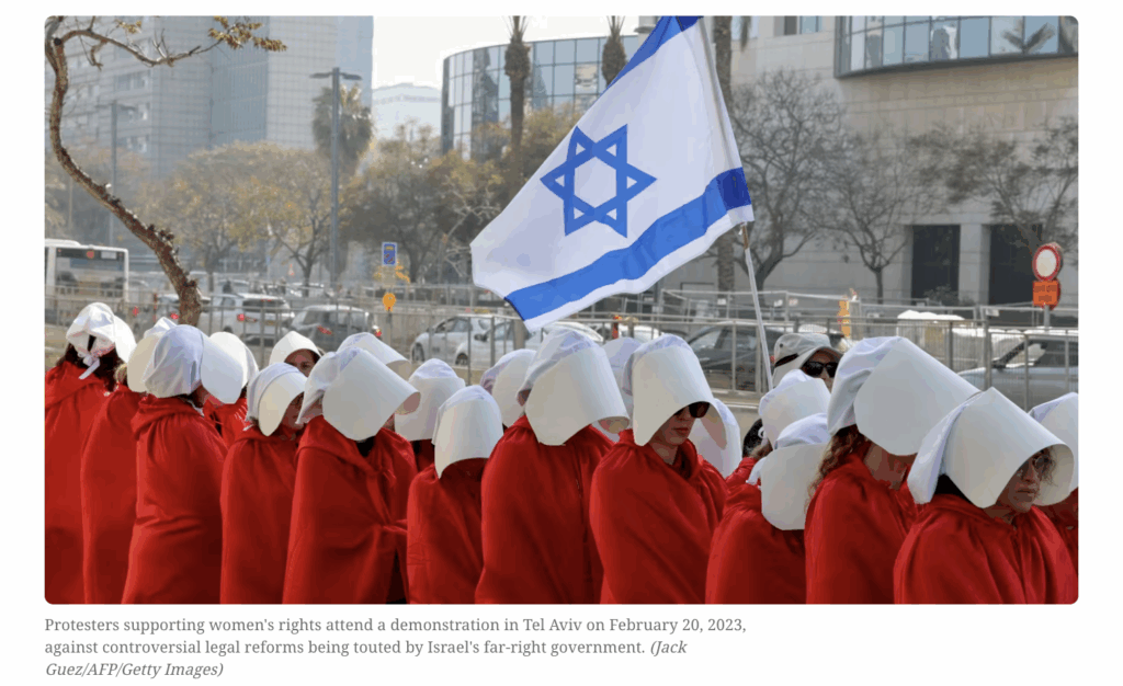 Without reading a single sentence, the article frames Israel through a distorted lens of reality. Women wearing red gowns and a white hat lead the cover image of the article. It presents the context of the article as a nightmarish reality, where women are living in a version of Margaret Atwood’s “The Handmaid’s Tale.” But read the fine print, and you see that this image, taken nearly three years ago, concerned demonstrations against Israeli legal reforms, not the decline of women’s rights.