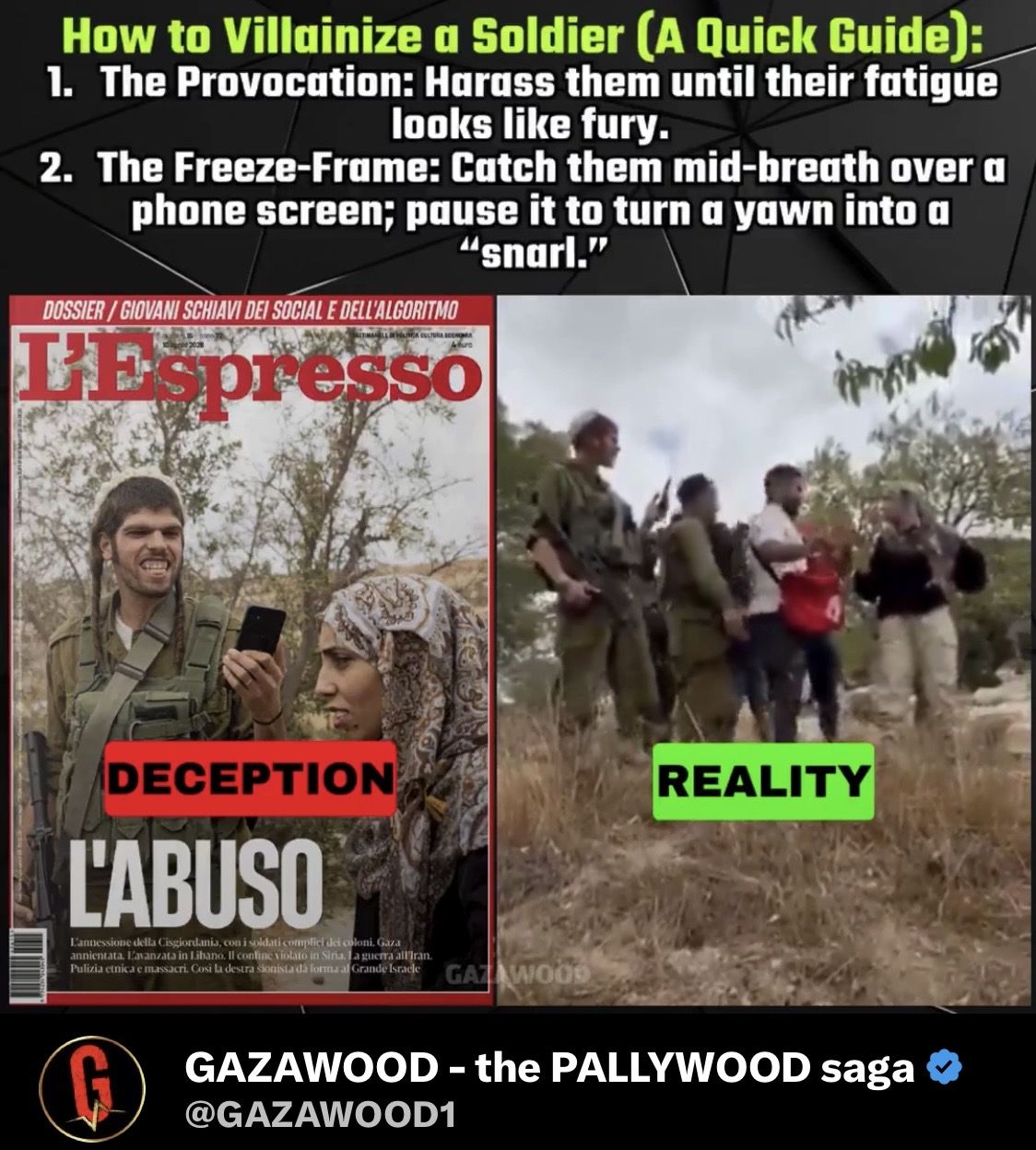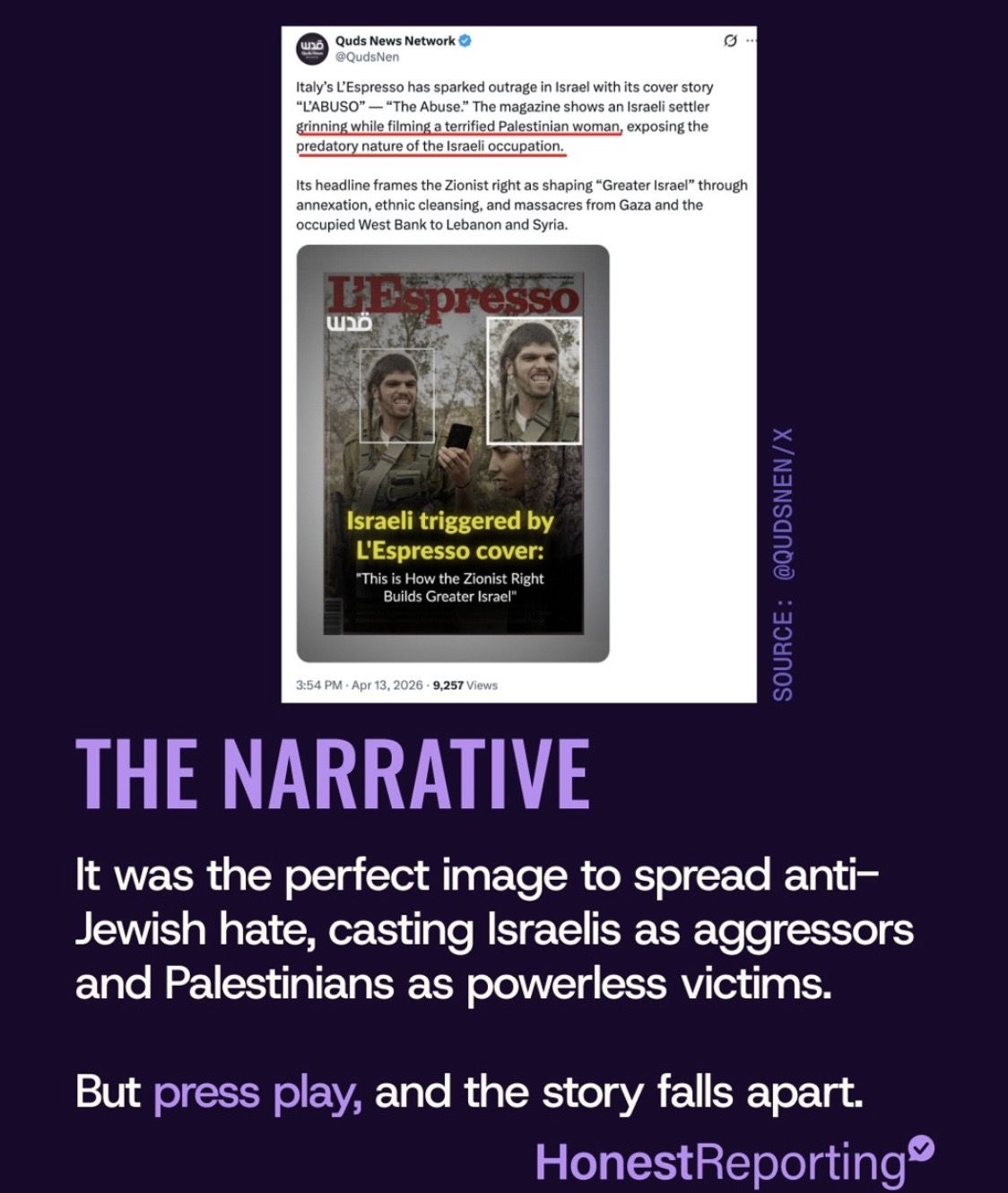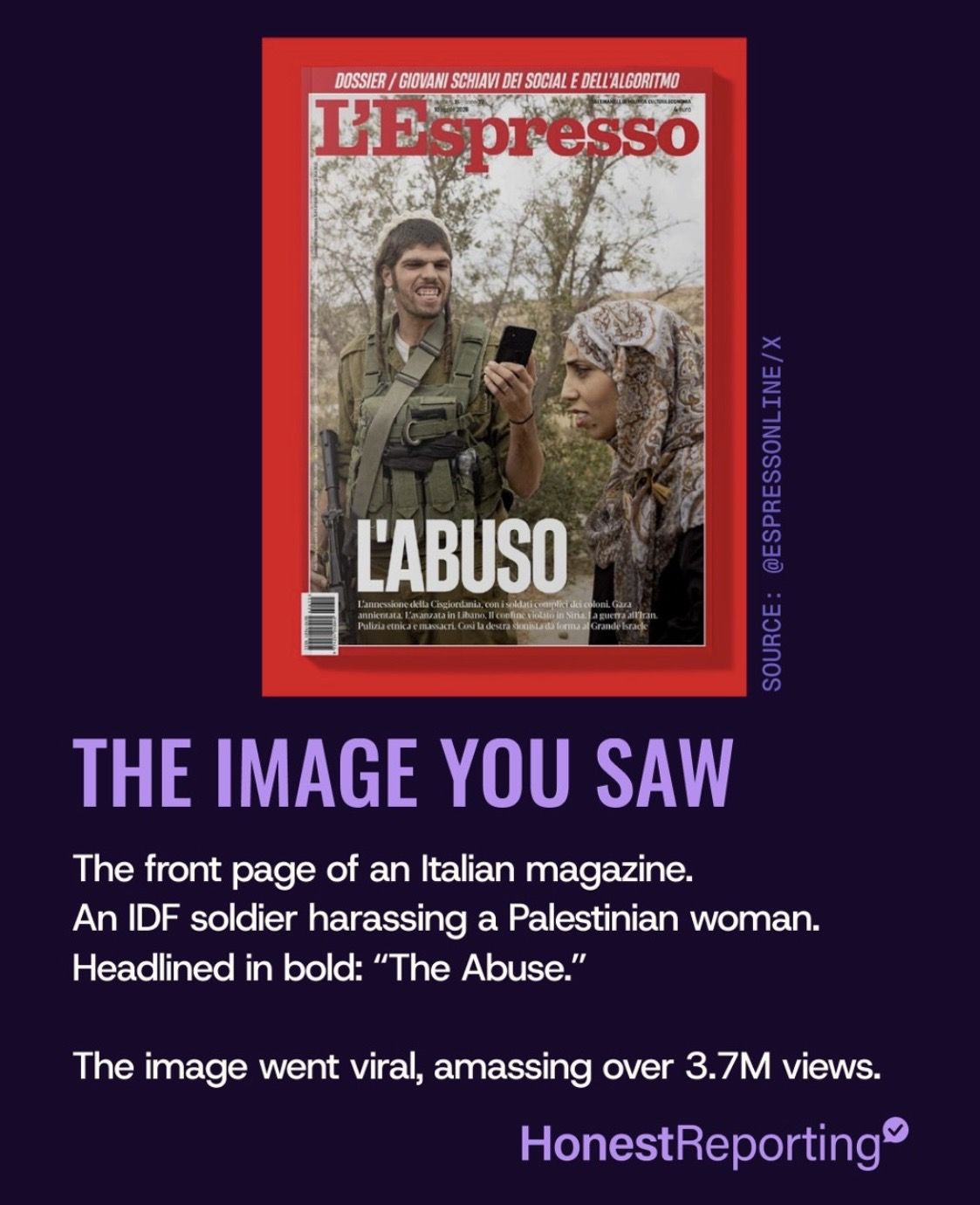 That is what happened when Italian magazine L’Espresso published a cover showing an Israeli soldier facing a Palestinian woman under the headline “L’Abuso” (“The Abuse”). The image spread rapidly across social media, accumulating millions of views within hours and quickly settling into a familiar narrative frame: aggressor and victim, power and vulnerability, accusation and judgment.