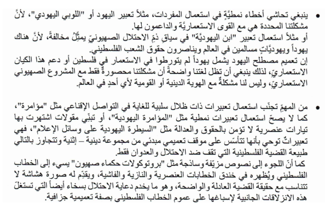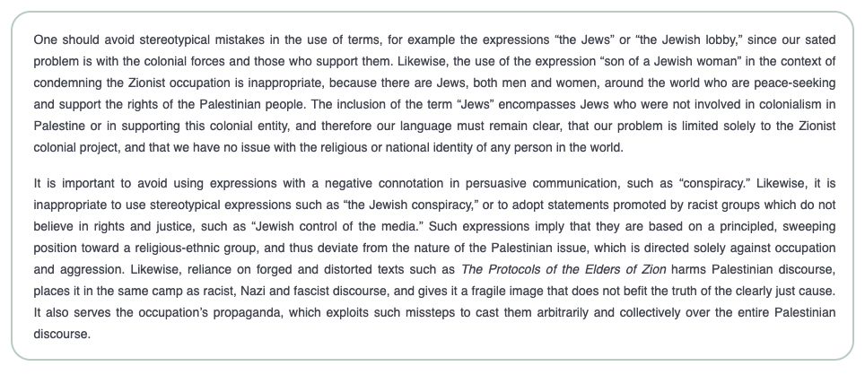 The guide goes further. It warns speakers not to say “the Jews” or “the Jewish lobby,” not because such claims are false, but because they “harm the Palestinian discourse” by making it appear racist and extreme.