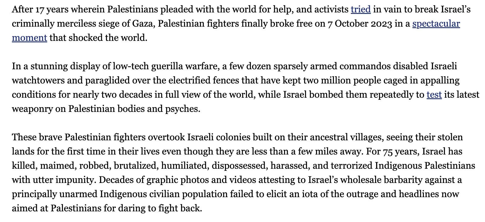 Below is one of her pieces for the Electronic Intifada, in which she referred to October 7 as a “spectacular moment” and called Palestinian terrorists “brave.”
