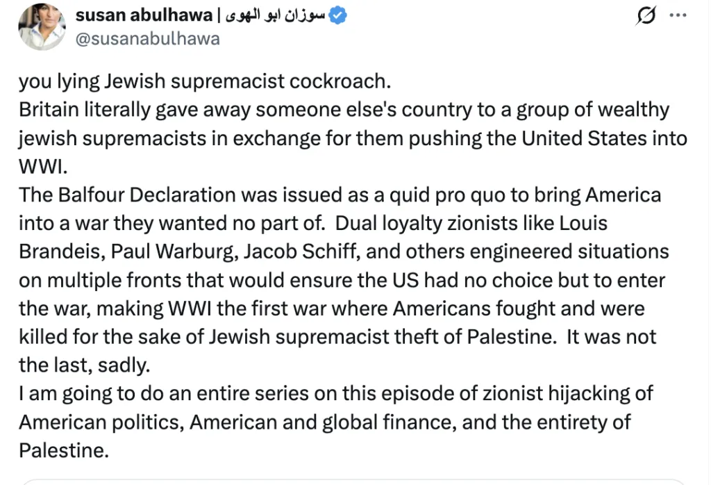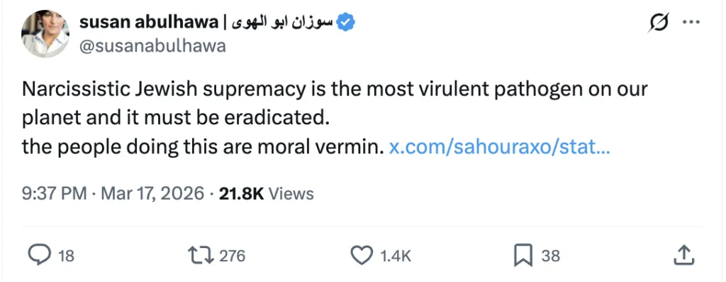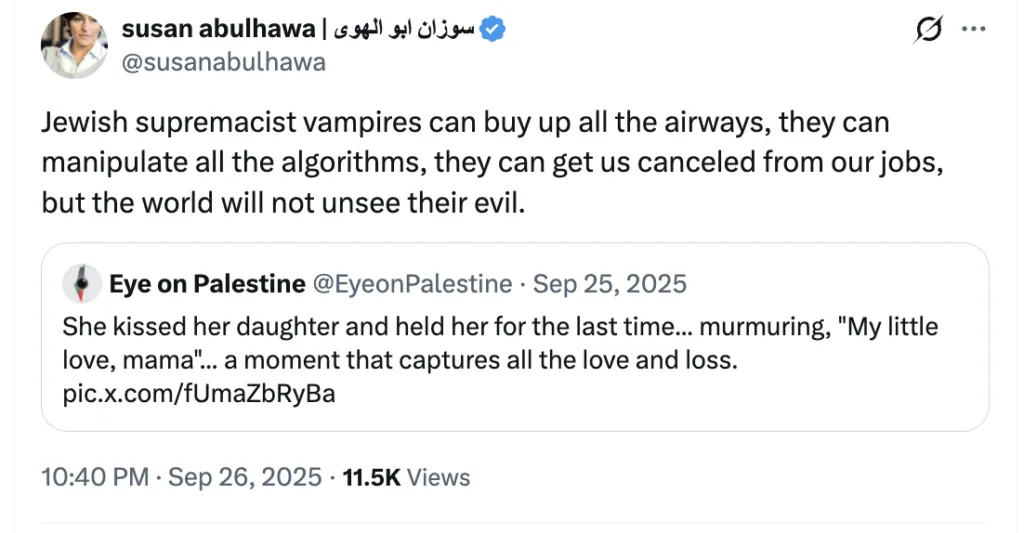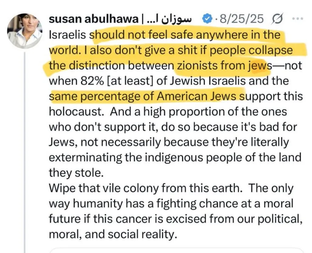 Susan Abulhawa is a Palestinian-American writer, activist, and proud antisemite. She has openly referred to Jews as “cockroaches” and “parasites.” She’s been an activist since 2001, and very soon became involved with the Boycott, Divestment and Sanctions Movement (BDS), among other anti-Israel causes. She now boasts 133k followers on her Instagram account and about 68k followers on her X account.