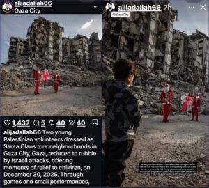 In late December, a series of photographs began circulating widely through international media feeds. Santa-clad figures appeared amid the rubble of Gaza, framed against collapsed buildings and scorched streets. Captions spoke of “bringing joy to children” and of Christmas celebrations under fire.