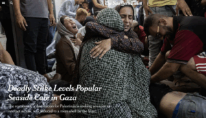 The New York Times cited Al-Shifa Hospital director Mohammad Abu Salmiya, reporting that “more than 30 people had been killed” at the seaside cafe. The article later quoted a Hamas statement claiming Israel had “targeted innocent civilians gathered at a rest stop on the Gaza City beach.” No scrutiny of either source was offered.