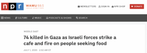 NPR blurred the lines between separate incidents, running the headline: “74 killed in Gaza as Israeli forces strike a cafe and fire on people seeking food.”