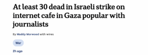 ABC News’ (Australia) framing implied journalists were the intended targets, describing the cafe as a spot “frequented by journalists, media workers, activists and students.” The reported death toll, again, came from Gaza’s “civil defense agency,” i.e. Hamas.